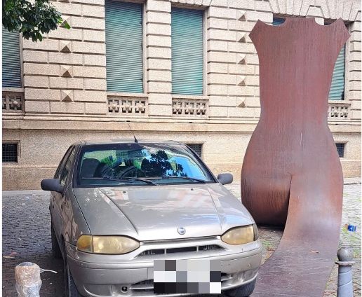 Um motorista apressado ou distraído estacionou seu veículo de forma inadequada na Rua do Rosário, no coração do Rio de Janeiro. Imagens divulgadas nas redes sociais mostram um Fiat Palio obstruindo parte de uma escultura pública.