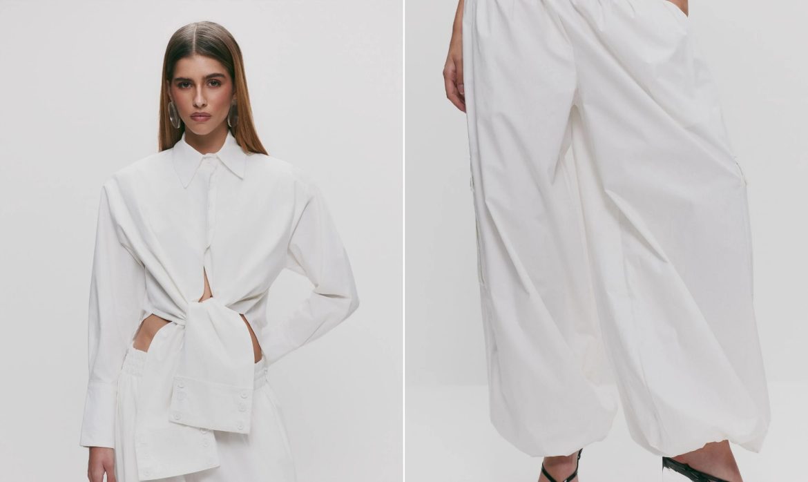 A camisa Papermoon, na cor branca, custou R$ 1.490 e foi combinada com uma calça de mesmo nome, avaliada em R$ 1.380. Ambas as peças são confeccionadas em 100% algodão, conforme informações divulgadas pela marca, que possui loja física localizada na Rua Iguatemi, 284, casa 13, em São Paulo. A produção foi elaborada pelo stylist Gabriel Fernandes, responsável por harmonizar os elementos da composição.